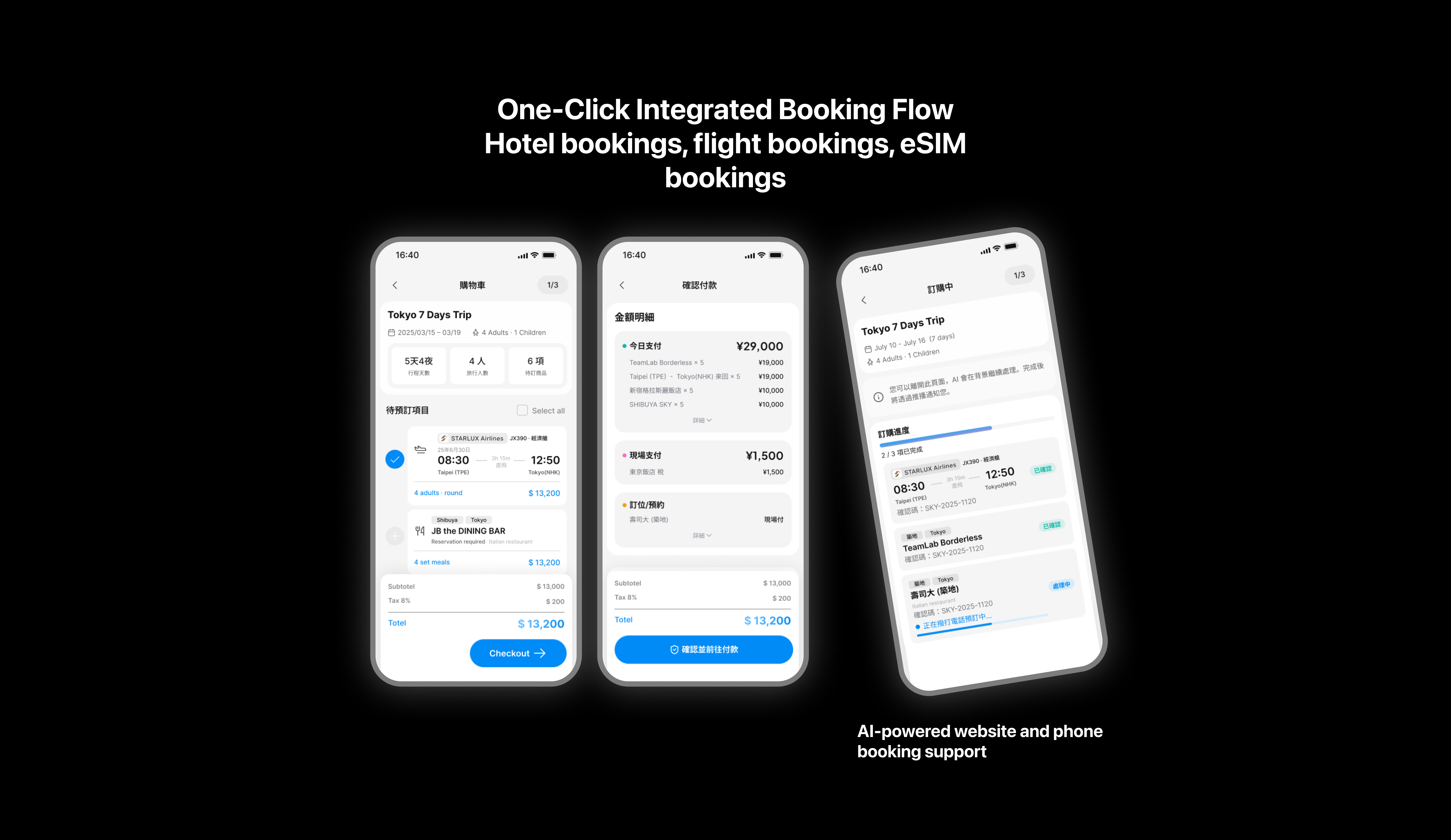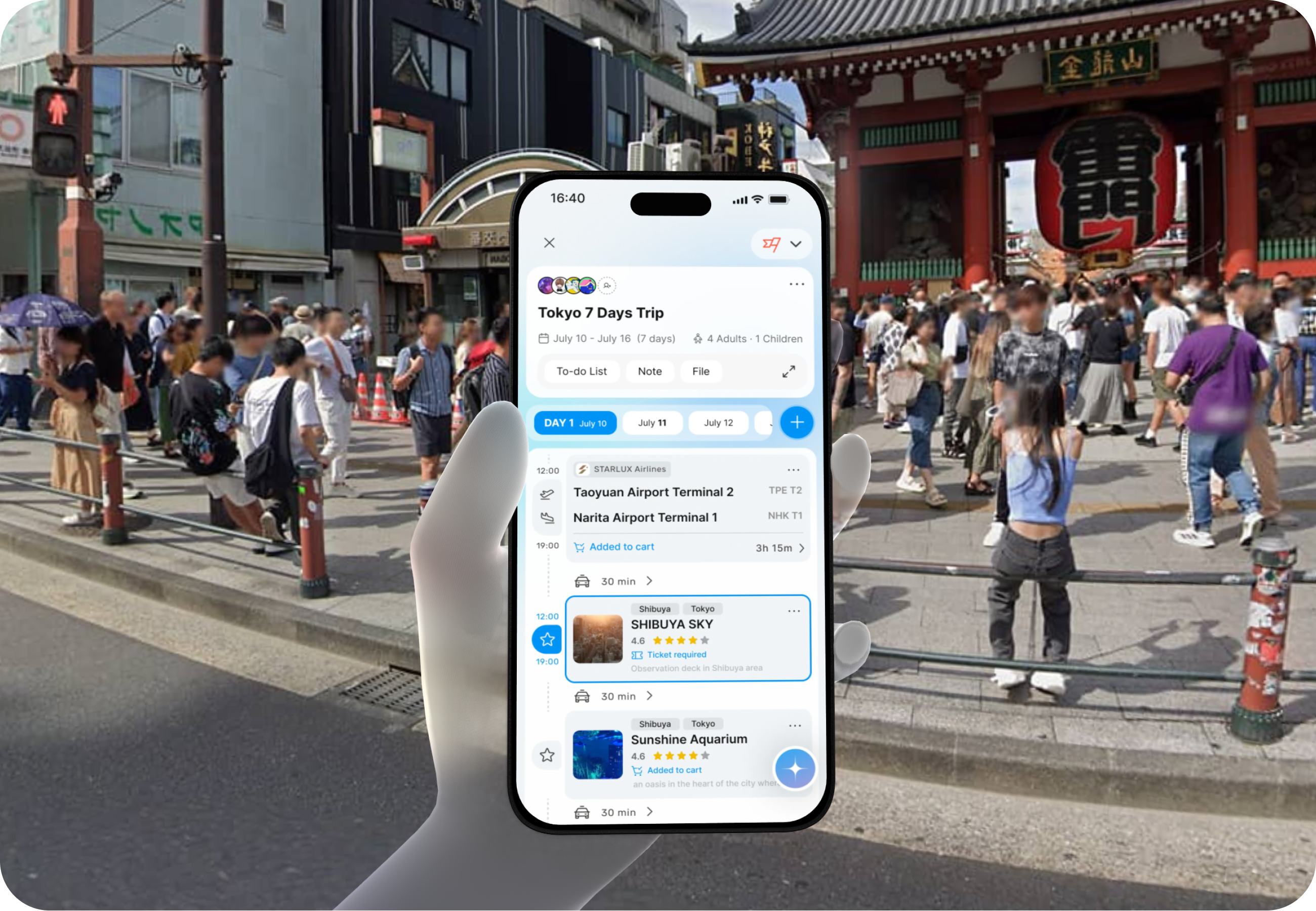 PickTrip is not only about generating plans. In its fuller product vision, the system identifies bookable nodes inside the itinerary and translates them into concrete commerce intents, connecting the planning layer with Hotel, Flight, eSIM, and ticket booking flows. That means users do not have to leave the context of their trip just to compare offers, add items to cart, pay, and manage follow-up steps. When direct APIs are unavailable, the platform also explores AI-assisted website or phone booking as an operational layer. From pre-trip reminders and packing lists to real-time recommendations, itinerary changes, document reminders, and budget tracking during the trip, PickTrip is designed as a companion system that can stay useful before departure, during travel, and into the preparation of the next journey.