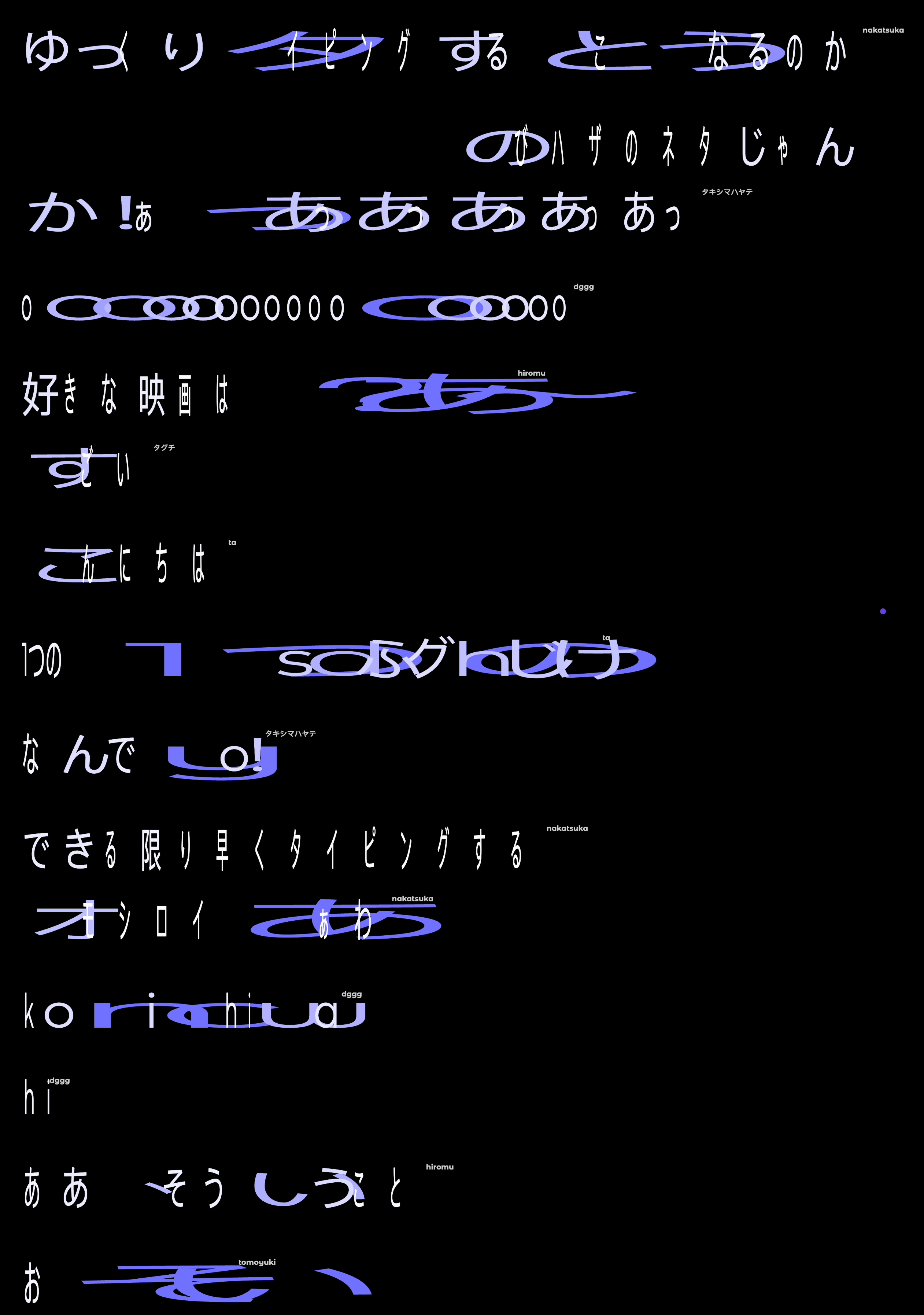 我們每天都在使用文字交流,但在快速的數位化時代,情感與時間的痕跡往往被平滑的文字格式所掩蓋。本作品希望通過字的變化 將時間和情感的流動重新注入文字,使每一段訊息不僅是溝通的工具,更成為感知與記憶的載體。 這個作品旨在探索文字輸入與時間之間的關係。透過捕捉每次按鍵輸入的時間間隔,系統會自動調整文本字距,視覺化呈現出打字過程中的速度變化。當打字速度加快,字與字之間的距離會縮短,形成緊密的排版;反之,當打字速度放緩,字距則會隨之拉開,展現更為寬鬆的布局。這種動態變化不僅反映了打字者的情緒、專注力或思考過程,更將時間這一無形元素具體化,賦予每段文字輸入獨特的節奏感與情感色彩。作品希望引導觀者思考,如何在我們日常的文字交流中,時間和情感潛藏在字裡行間,並與其互動。
